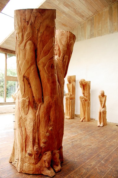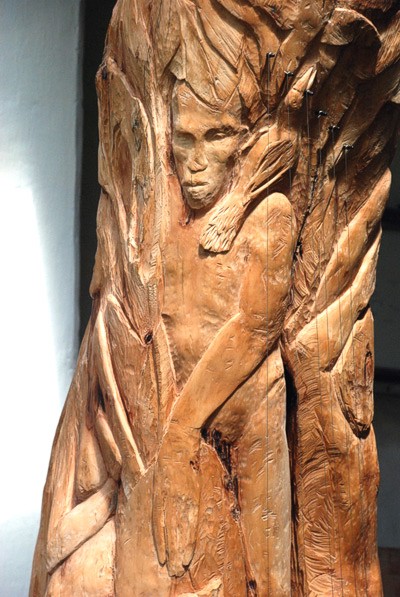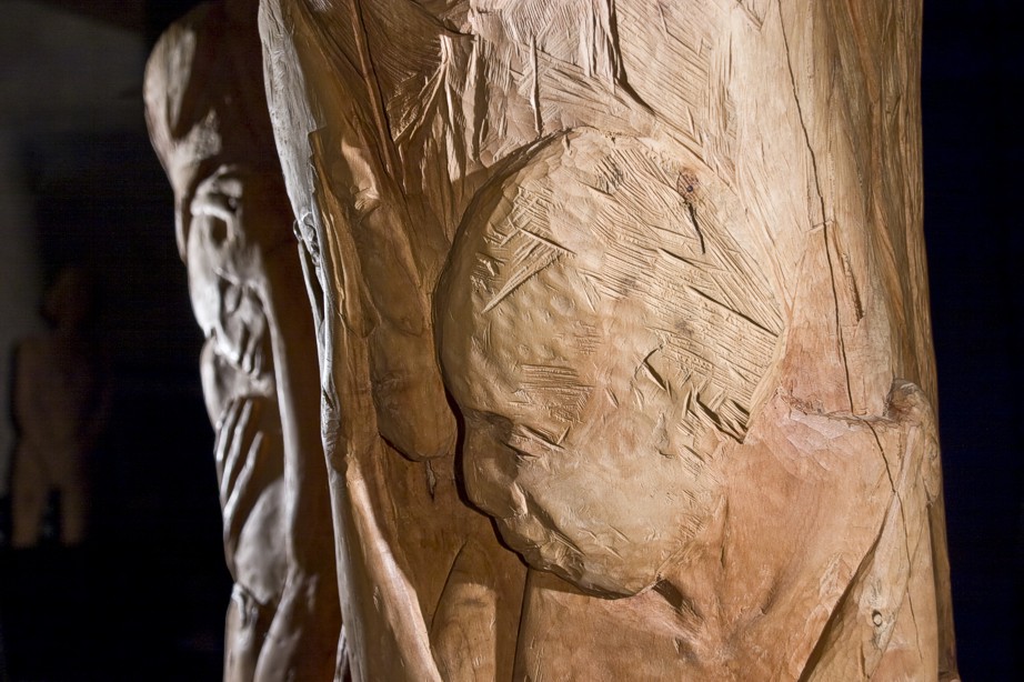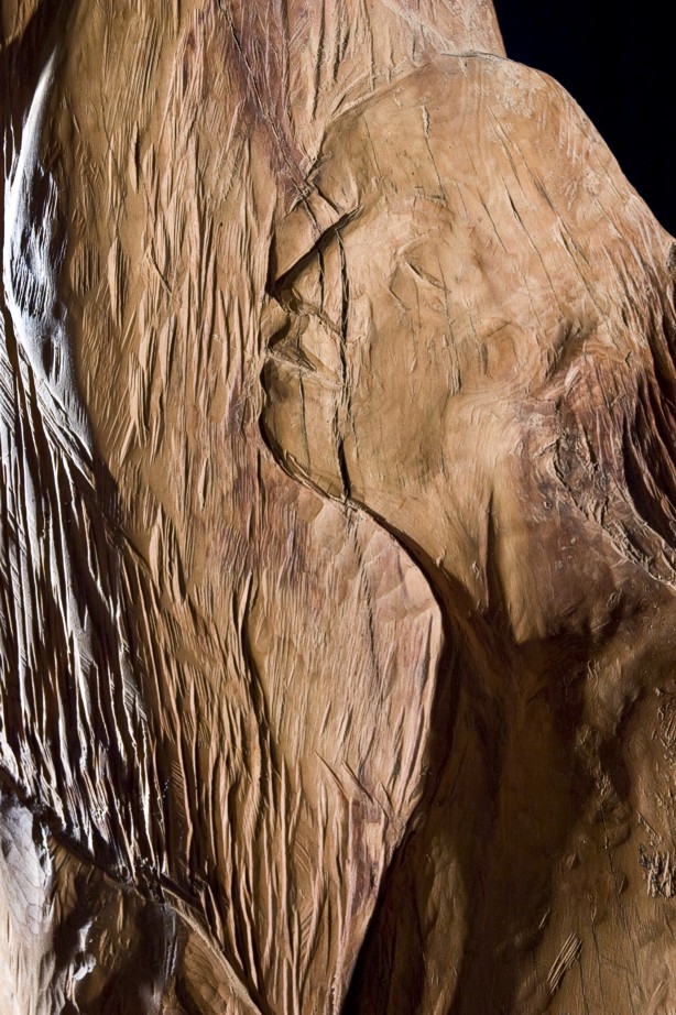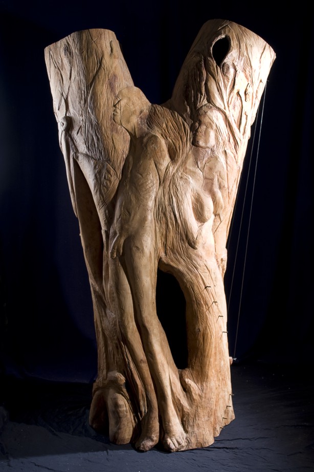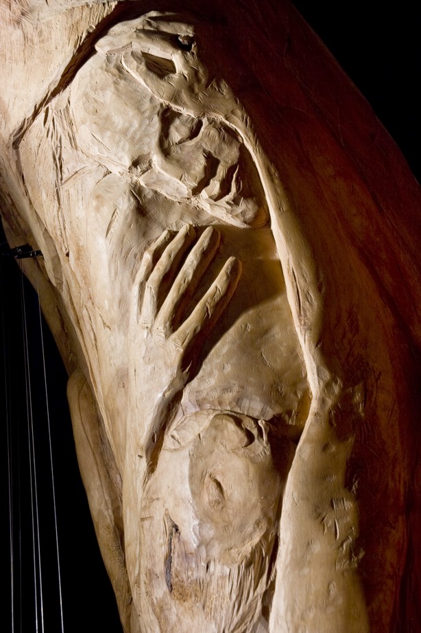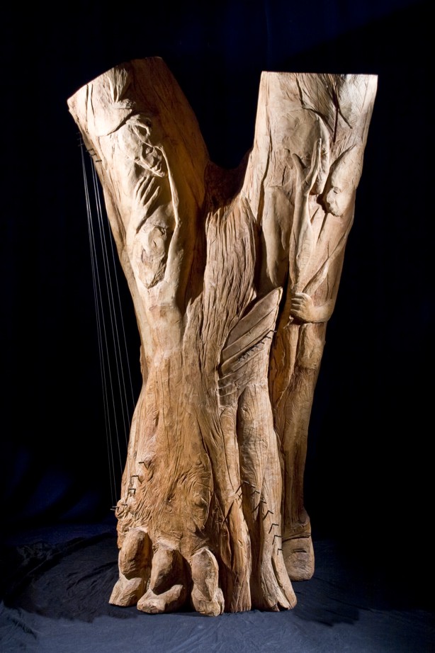 „Rückbindung“ nennt Christina Rode ihren einmaligen Klangbaum, den sie aus dem Holz eines sehr alten Apfelbaumes schuf, aus einem Stamm mit zwei aufragenden Aststümpfen, die Rinde abgeschält, das Innere entkernt und ausgebrannt. Aus der Landschaft der Oberfläche, den geheimnisvollen Schatten einer Abfolge von Hügeln, Furchen und Buchten treten Wesen mit Gesichtern, Mensch und Tier. Ihre Bewegungen nehmen das Streben aufwärts mit starken aufeinander bezogenen Gesten auf, zu einem Reigen des Lebens. Er fügt sich zu einem Relief, das man nicht nur mit den Augen ergründen, sondern mit Fingerspitzen berühren möchte, um nichts auszulassen und nichts zu verlieren. Gruppen von Saiten überspannen sanft gewölbte Flächen und in der dunklen Tiefe der Baumhöhle entdeckt man tastend zwei Basssaiten. Bei Annäherung an diesen Liebes- und Lebensbaum wird man verführt, nicht nur genau hinzuschauen, auch zum Spiel, den Schwingungen der Tonfolgen nachzuspüren und auf den Asttrommeln den Rhythmus von Herzschlag und Handbewegung zu harmonisieren. Video